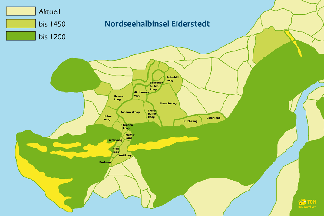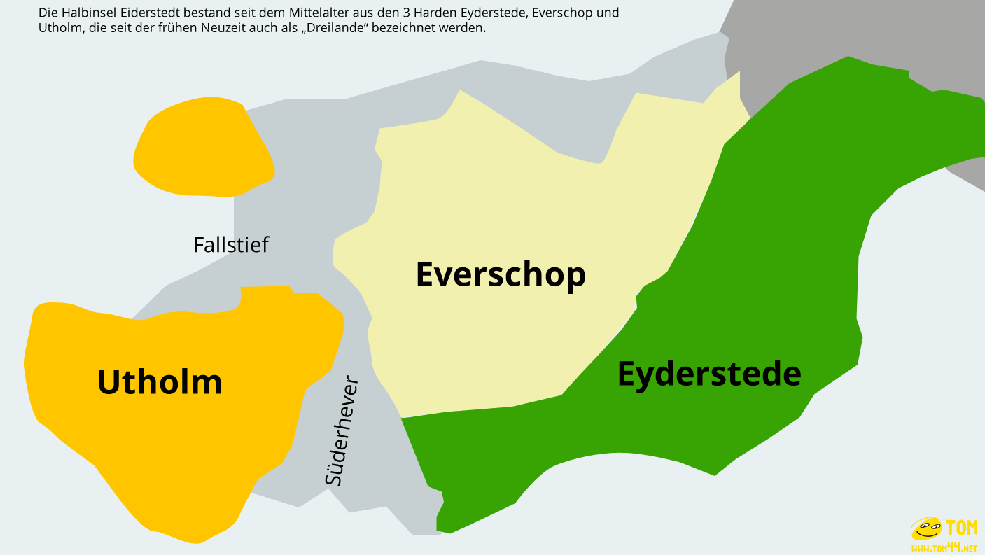 Die Halbinsel Eiderstedt bestand seit dem Mittelalter aus den 3 Harden Eyderstede, Everschop und Utholm, die seit der frühen Neuzeit auch als „Dreilande“ bezeichnet werden. Harden bildeten, ähnlich wie heute die Gemeinden und Kreise, eine administrative Einteilung des Dänischen Reichen.